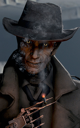 Sample Equipment: Non-unique version of Deliverer, hunting rifle, knives (too many), grenades, any variation of gas mask (very common to see him with one on when not undercover). No typical outfit as he dresses to blend in, but when he's being himself instead of a cover, he dresses in layers on layers on layers. Oh, and don't forget his gloves